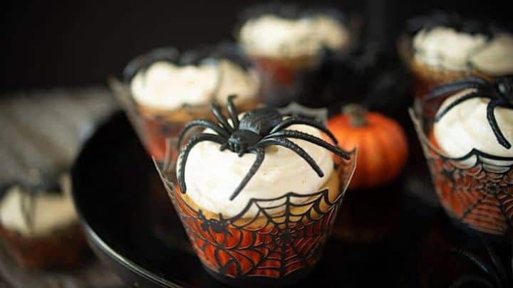 Fluffy cupcakes flavored with pumpkin spiced applesauce with pumpkin spice frosting are made spooky for Halloween with fake spiders.
