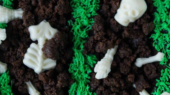 This Halloween brownie graveyard, is a fun and edible centerpiece for a spook-tacular party. A large brownie has graves cut out and then decorated with headstones and scary chocolate skeletons.