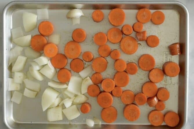 - Add the carrots, onion and garlic to a sheet pan/tray and spread out evenly.