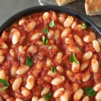 Tuscan Tomato Beans (fagioli all’uccelletto) is a simple, vegan Italian side dish made with ‘from scratch’ cannellini beans (Italian white beans), cooked in a tomato sauce with onion, garlic, fresh sage and crushed tomatoes.