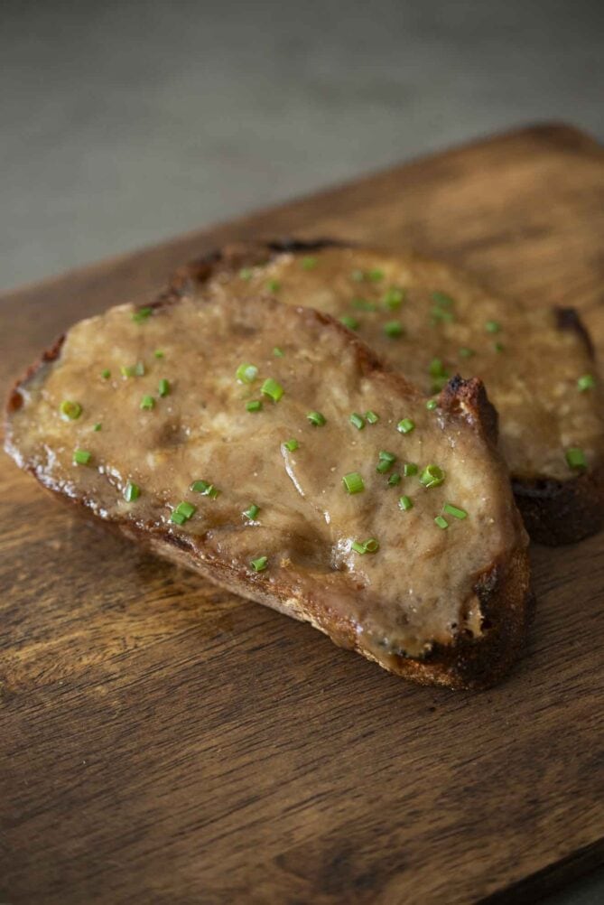 The bread is just as important as the cheese sauce. If the bread is too thin, it will turn out soggy, so regular white sliced bread won’t work. I like a sturdy, whole, crusty loaf and slice my own. It can be sourdough or any kind of seeded or grain bread you like.
