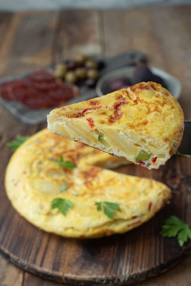 A classic Spanish Tortilla (tortilla de patatas or tortilla Española) has only one addition and that is potato ( sometimes onion). I’m making this Vegetable Spanish Tortilla Omelette colorful and even more delicious by adding vegetables red bell pepper and zucchini (courgette). Serve for tapas, breakfast/brunch or a light meal.
