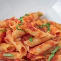A quick and easy tomato sauce that is a little garlicy, a little spicy with fresh basil tossed with penne.
