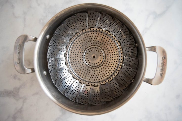 If you don’t have a proper steamer (which I don’t), you don’t need one. If you have a tall pan (8 quart is what I use) and a steaming basket, this is all you need. You will need to elevate the basket on something heat-proof, I use 3 ramekins.