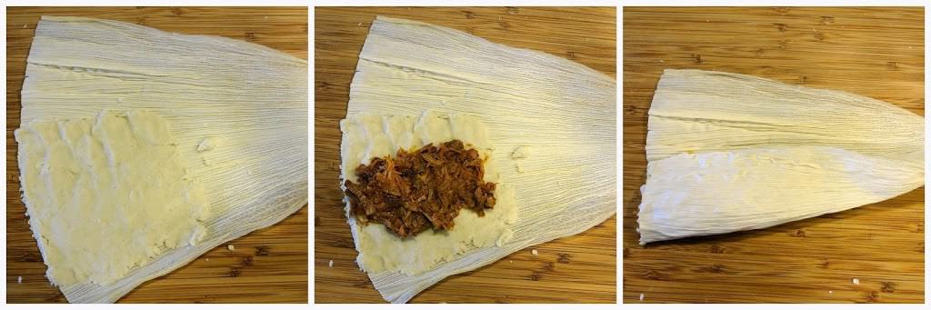 Soak the corn husks in hot water for a few minutes to soften. Lay the corn husk with the smooth side facing up and the thin end facing you. Spread the masa dough in an even layer starting halfway up and spread to cover the entire top half of the husk, out to the sides. You can see this done in the video.