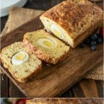 A delicious, moist baked loaf with bacon and cheese along with hard boiled eggs baked right in the center.