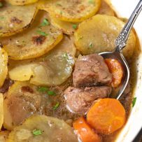 Old Fashioned Lancashire Hot Pot is the quintessential meat and potatoes dish. Tender pieces of lamb, vegetables and sliced potatoes braised in the oven. One pot comfort food for the whole family. Popular pub grub that is traditionally baked in a heavy cast iron or enamel pan with a lid. A hearty and comforting one-pot meal that consists of lamb, sliced onions, carrots all cooked in a well-seasoned beef stock, topped with thinly sliced potatoes.