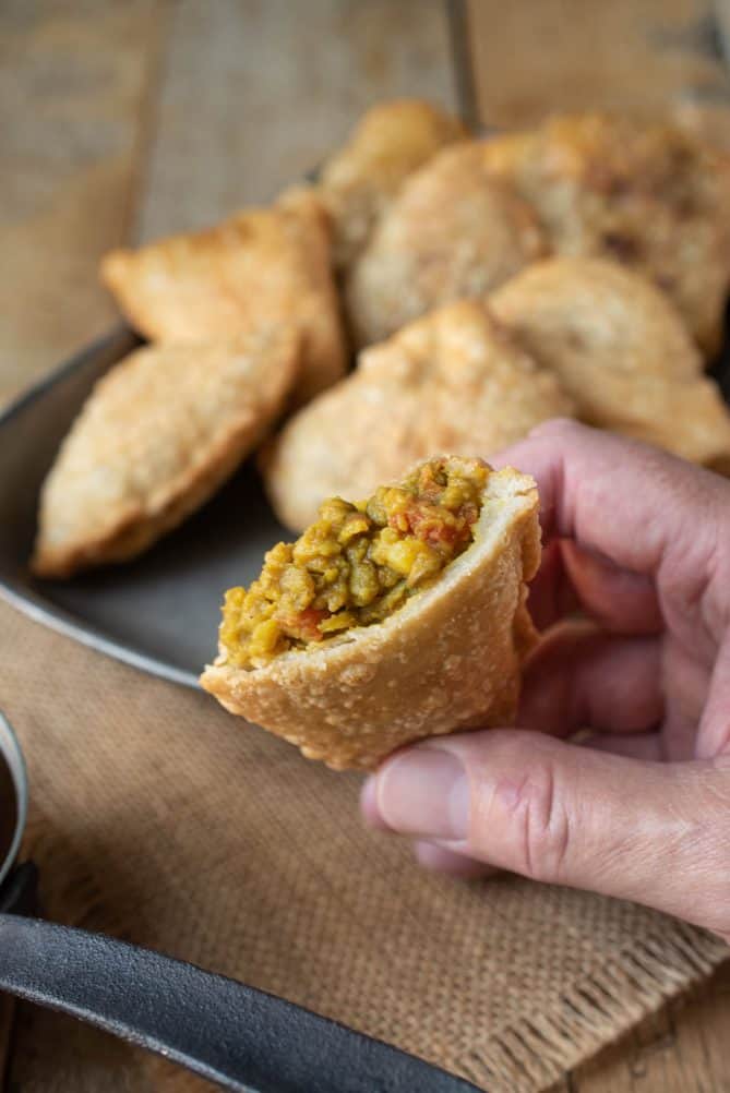 Delicious Indian lentil (dal) curry wrapped in pastry. Lentil Dal Curry Samosa is the epitome of vegetarian flavors all in 1 bite, served with a classic chutney.