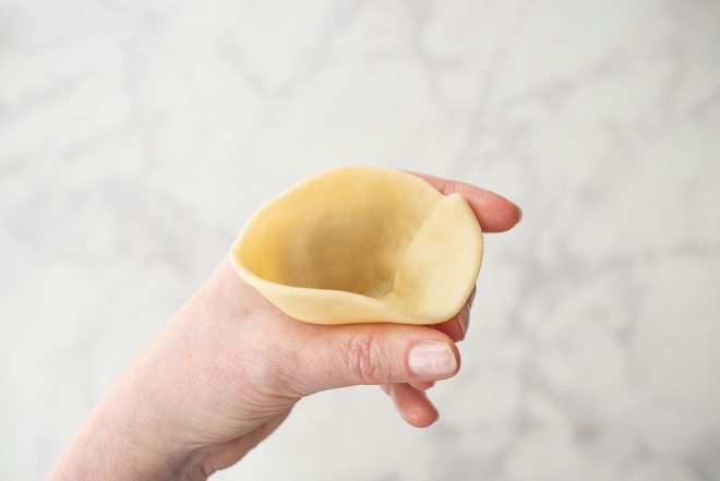 - Take one of the halves and make a cone by taking the two ends of the cut side folding them into the center of the curve so the center of the cut side makes the point of the curve. Wet the edges with water using your finger and press the edges firmly together making sure they are well sealed. Don’t be afraid to manipulate the dough and shape. If you mess up, reshape the dough and start again.