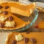 This Maple Sweet Potato Pie Recipe is a delicious twist on a classic holiday dessert. Classic sweet potato pie filling gets a flavor boost from good maple syrup and decorated with pastry maple leaves and maple glazed pecans.