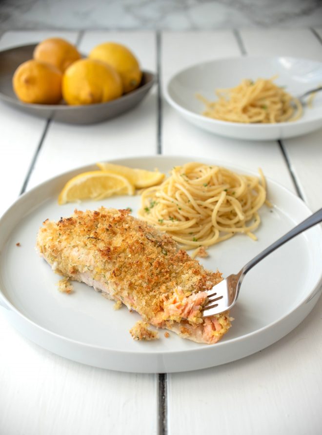 Lemon Parmesan Crusted Salmon is easy and gourmet enough to serve for fine dining evening at home. This salmon dish has a delicious crispy lemon parmesan topping made from panko breadcrumbs along with fresh dill, both pair beautifully with salmon.