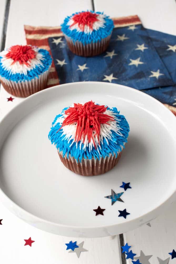 Festive and very patriotic, Red, White, and Blue Red Velvet Firework Cupcakes make the perfect dessert to feed a crowd for Memorial Day and the 4th of July, and their colors also work well for my UK friends to celebrate. The cream cheese frosting not only matches the flag colors—it’s styled to look like fireworks.
