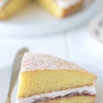 Traditional Victoria Sponge Cake consists of 2 layers of light-as-air sponge cake that sandwich whipped cream and jam. Perfect for a British afternoon tea treat or anytime dessert.
