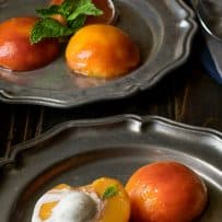 These bourbon poached peaches are a really easy dessert dish that will be sure to impress. The peaches can be poached ahead of time and then just serve when you’re ready. The poaching liquid is reduced to make a lovely thick Bourbon sauce and then I topped the peaches with a creamy vanilla ice cream.