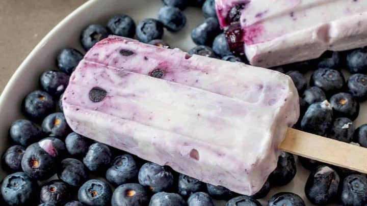 Blueberry purée and whole blueberries are mixed with Greek yogurt, then frozen into protein-packed Blueberry Coconut Frozen Yogurt Popsicles.