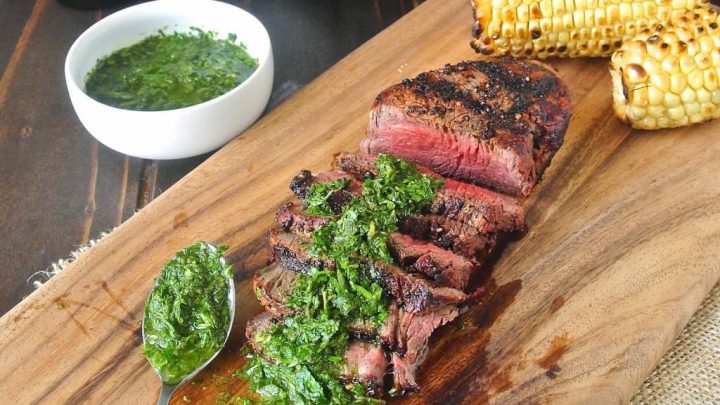 Grilled filet mignon with mint and parsley. A perfectly grilled lean cut of beef is simply seasoned, grilled and served with a sauce of fresh herbs, mint and parsley.
