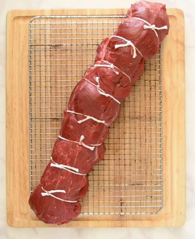 When you buy your beef tenderloin, it may come untied. What do I mean? If you watch the video on this page, you’ll see that I tied the tenderloin with butcher’s twine to keep it shapely and tight, as it can be floppy and the thin ends can be tucked in. This ensures it roasts more evenly. If you’re not comfortable doing this yourself, ask your friendly butcher to do it for you.