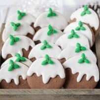 If you do choose to give these Christmas pudding cookies as gifts, you could nestle in a wooden box, like cute one I found. Or, place them in cellophane gift bags that are used for party favors that can be found in so many stores and secure them with pretty holiday ribbon. Fun gift and personalized giving.