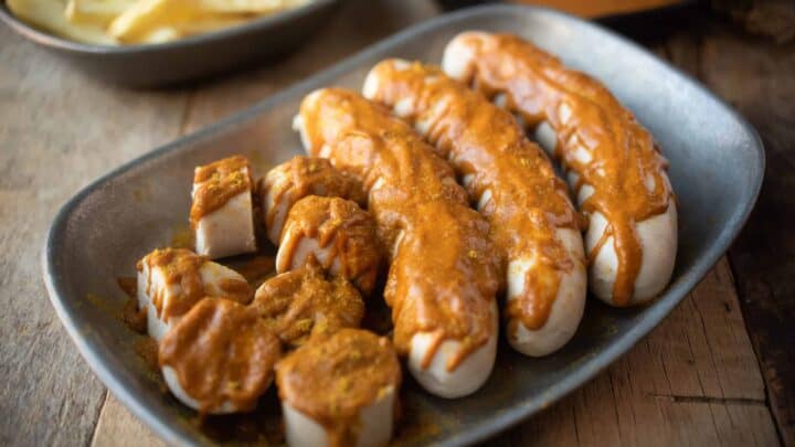 A from-scratch curry flavored ketchup that is famous in Germany served over sauce.