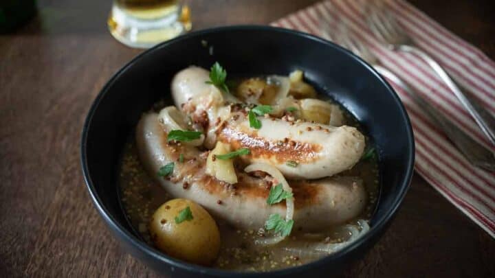 German weisswurst sausage are cooked with onions, potatoes in a delicious mustard, beer sauce.